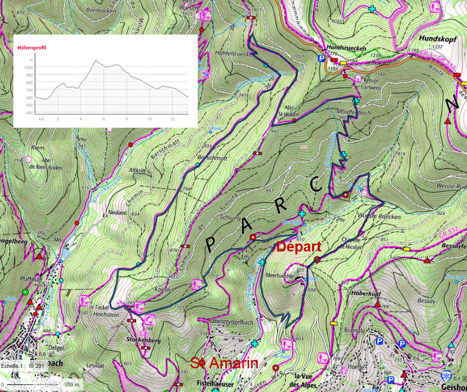 Marche classique : Nous partirons au-dessus de St Amarin, au bout de la route du Hintervogelbach, nous passerons par l'Auberge du Mehrbächel, puis monterons au Mordfeldloch et nous irons à l'Abri St-Hubert où nous ferons notre pose pique-nique. Nous rentrerons tranquillement à nos voitures.