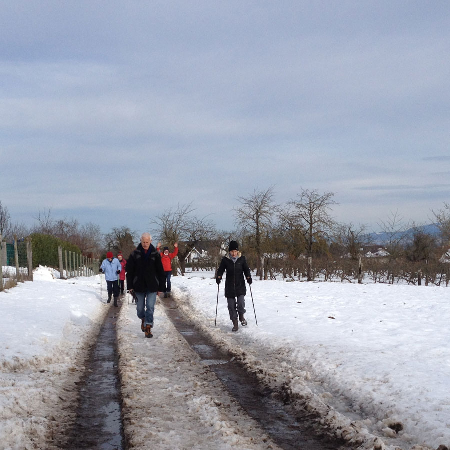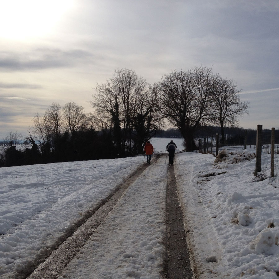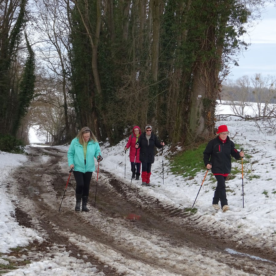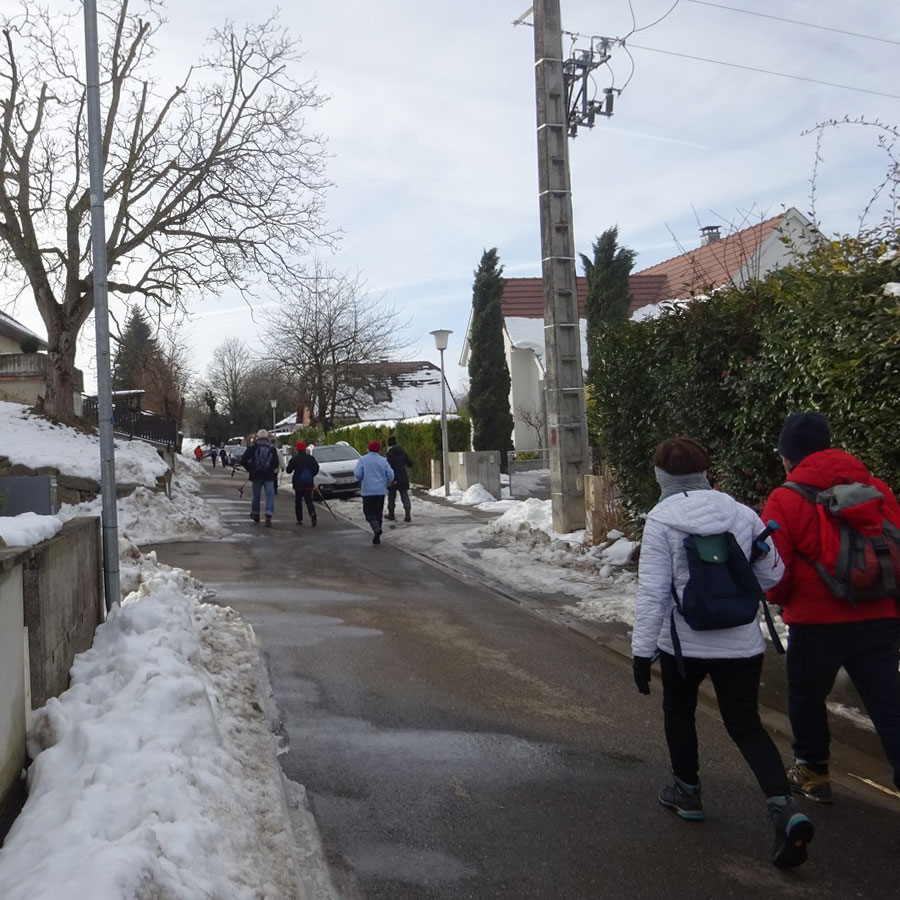 Environ 8 km sur chemins ruraux empierrés, un dénivelé de 100m environ, du beau temps pas trop froid. Des chemins encore couverts de neige, des chemins un peu boueux dus au passage de tracteurs, voitures 4/4, mais cela a été l'occasion de marcher dans un paysage différent.