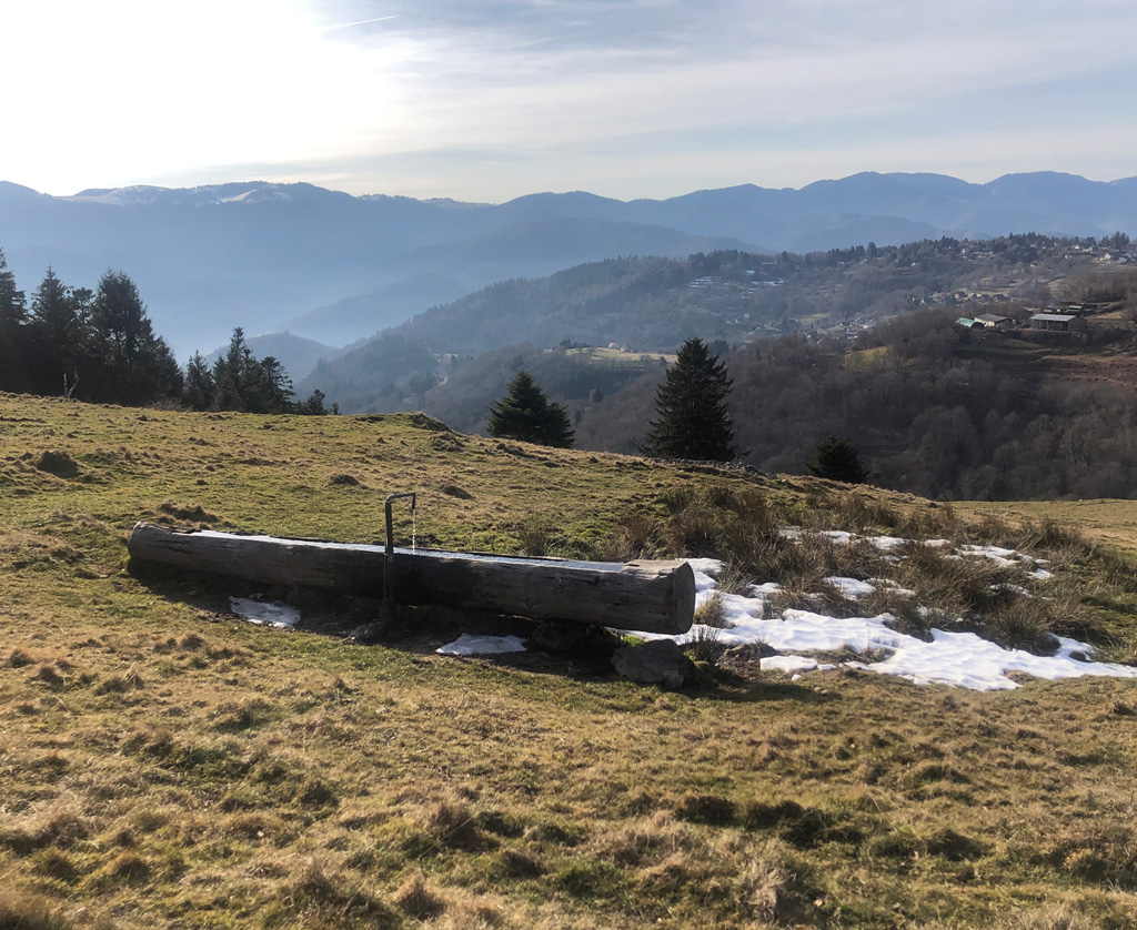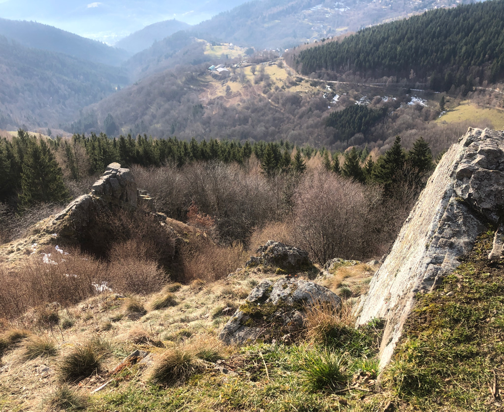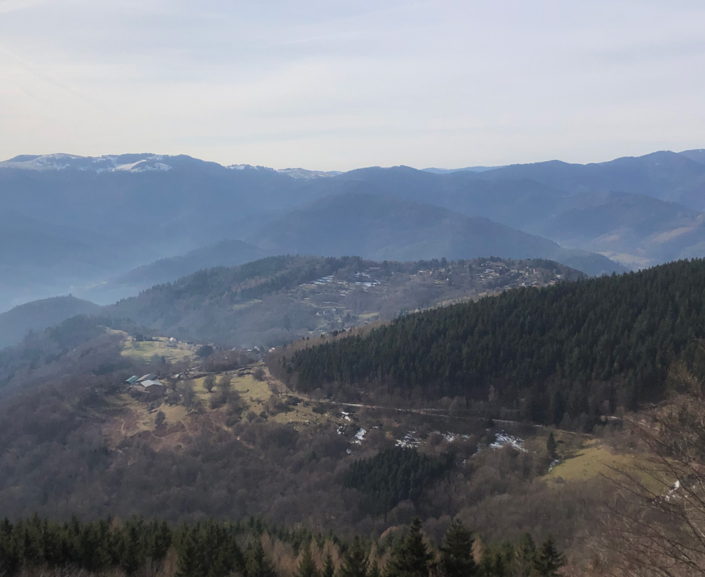 Le retour, un peu en montagnes russes avec des vues sur Geishouse, sur la "boule" du Grand Ballon et au loin le Rossberg et le Thannerhubel.