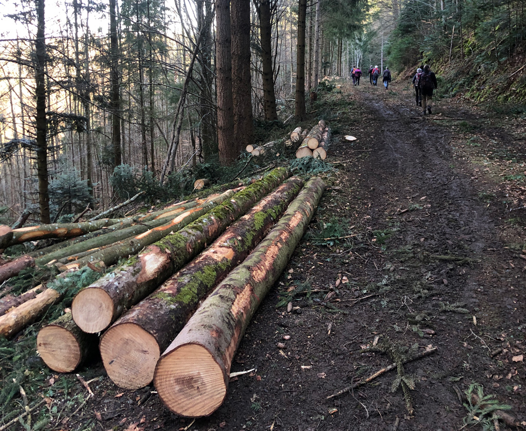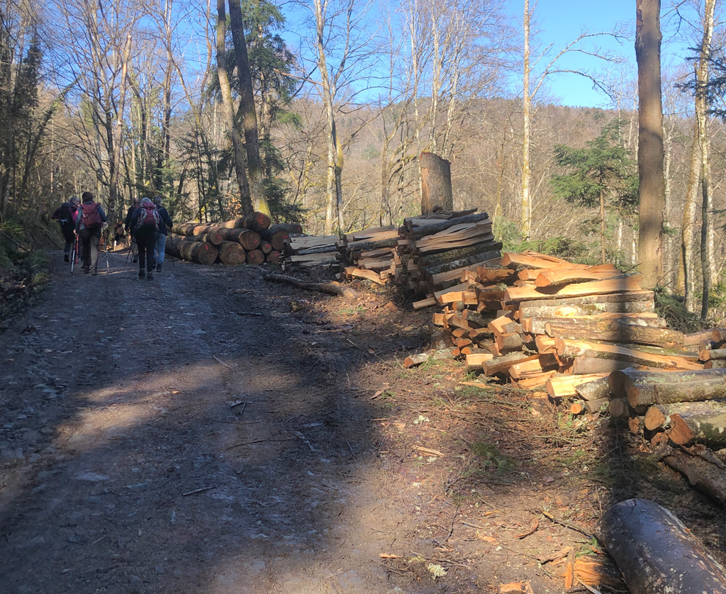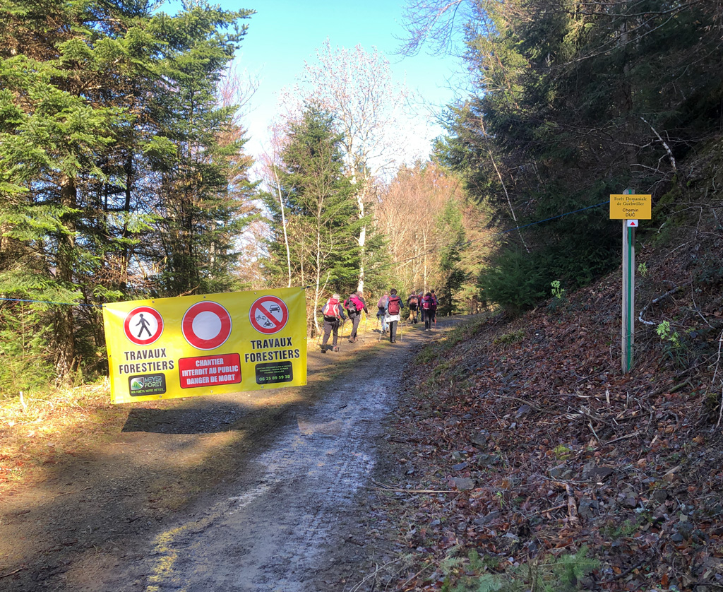 A peine repartis, nous tombons une fois de plus sur des travaux forestiers très récents. Nous nous sommes fait intercepter par les bûcherons : "pas possible de passer ! interdit ! et les banderoles annonçant le chantier ça sert à quoi ! etc".