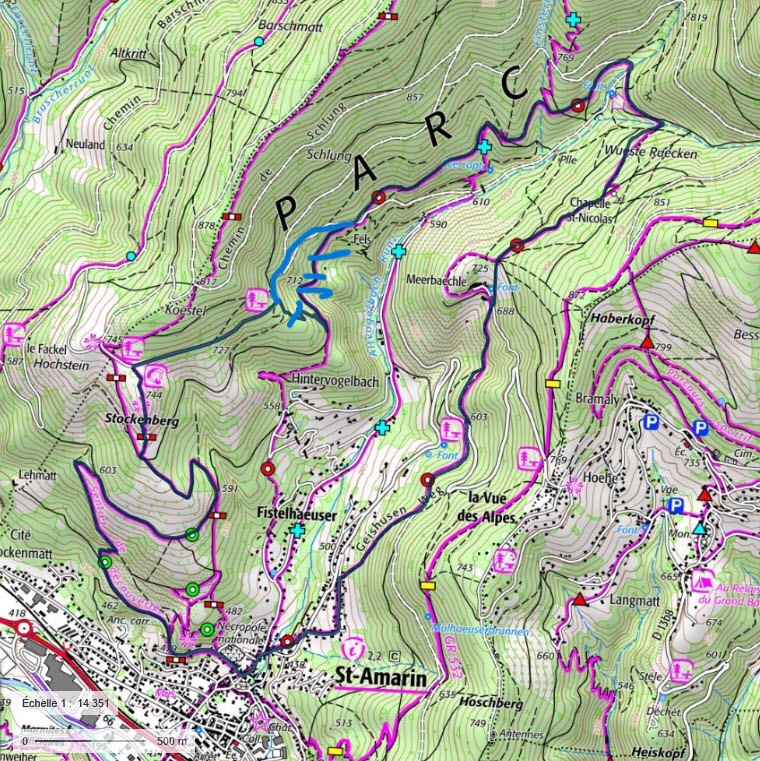 Marche douce proposée : Départ depuis la Nécropole de St Amarin, passage par le Mehrbächel et retour par le sentier de découverte.